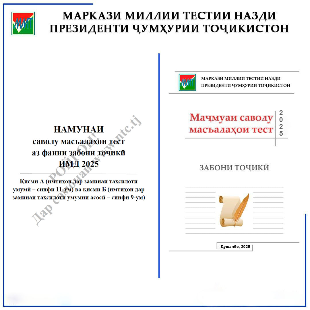 Ба таваҷҷуҳи довталабон ва алоқамандони дигари имтиҳонҳои марказонидаи дохилшавӣ ба муассисаҳои таълимии таҳсилоти миёна ва олии касбии Ҷумҳурии Тоҷикистон (ИМД) дар соли 2025 расонда мешавад, ки гунаҳои электронии маҷмуаҳои саволу масъалаҳои тест (https://ntc.tj/tj/elon1-2.html) аз субтестҳои қисмҳои А (имтиҳон дар заминаи таҳсилоти умумӣ – синфи 11-ум) ва Б (имтиҳон дар заминаи таҳсилоти умумии асосӣ – синфи 9-ум), инчунин дастури иттилоотию методии “Роҳнамои довталаб” (https://ntc.tj/tj/rohnamoi-dovtalab.html) дар сомонаи Маркази миллии тестӣ ҷойгир карда шуданд.