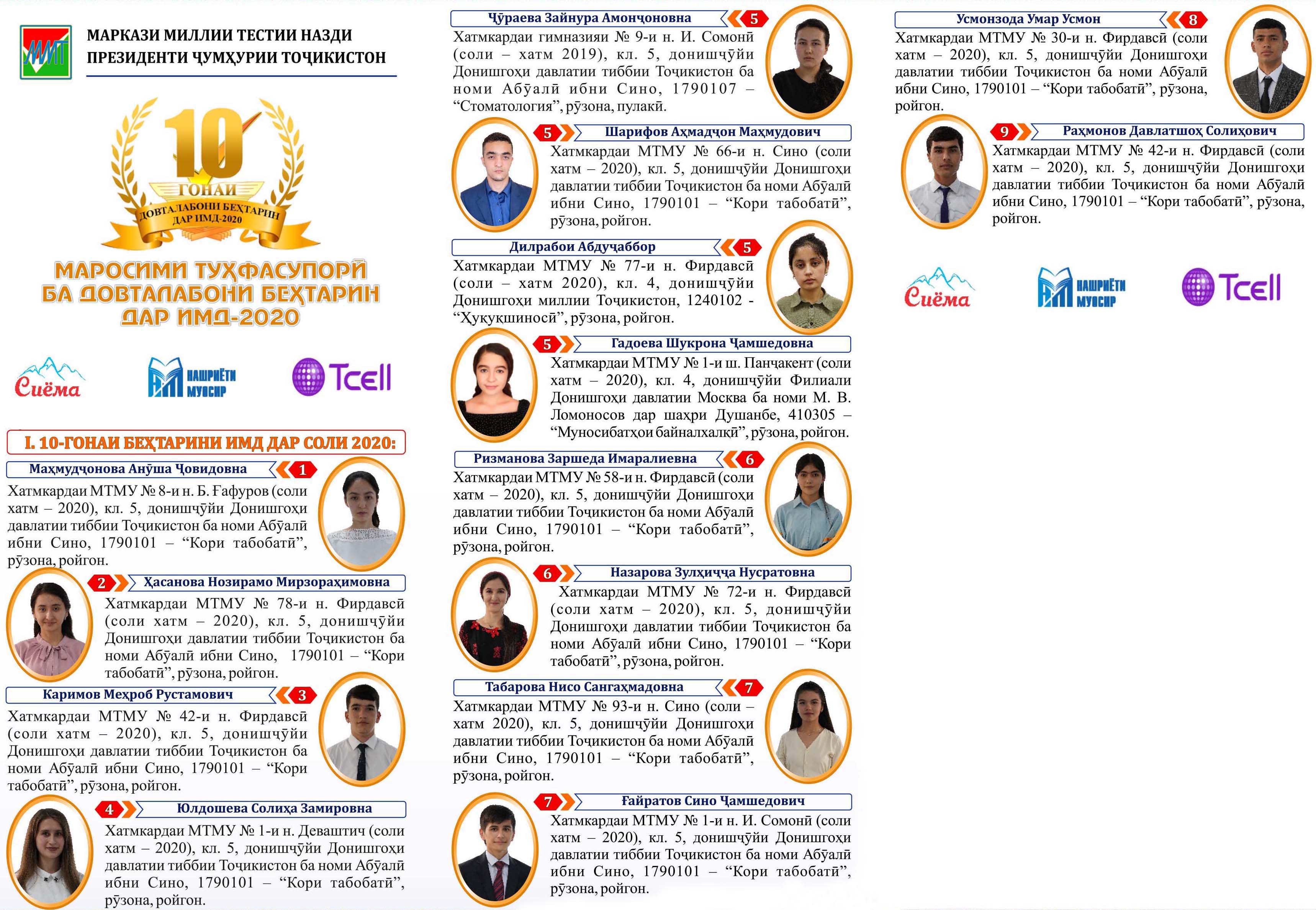 - Табарова Нисо Сангаҳмадовна – хатмкардаи МТМУ № 93-и н. Сино (соли хатм 2020), кл. 5, донишҷӯйи Донишгоҳи давлатии тиббии Тоҷикистон ба номи Абӯалӣ ибни Сино, 1790101 – “Кори табобатӣ”, рӯзона, ройгон.
